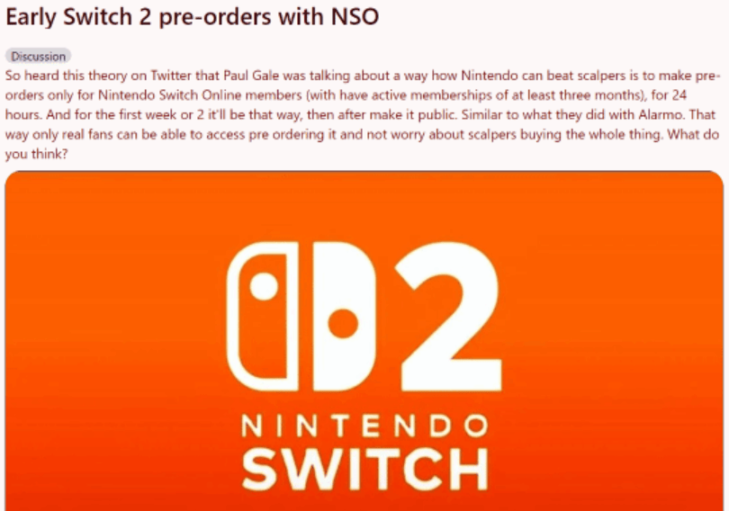 Paul Gale认为,任天堂可以在Switch 2发售后的前两周,只为NSO会员(至少拥有三个月以上有效资格)提供24小时的预购,然后再面向所有玩家贩售,类似他们对任天堂闹钟做得那样。