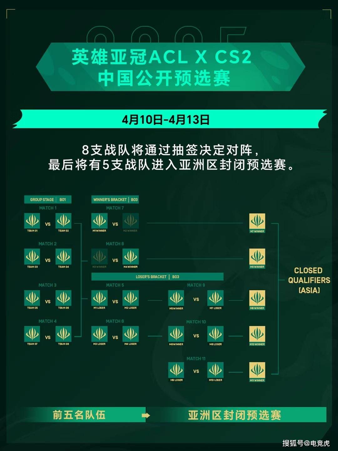 4月10日至13日,晋级中国公开预选赛的8支战队将通过抽签决定对阵,通过BO1及BO3的双败赛制,决出5支战队成功晋级亚洲区封闭预选赛。