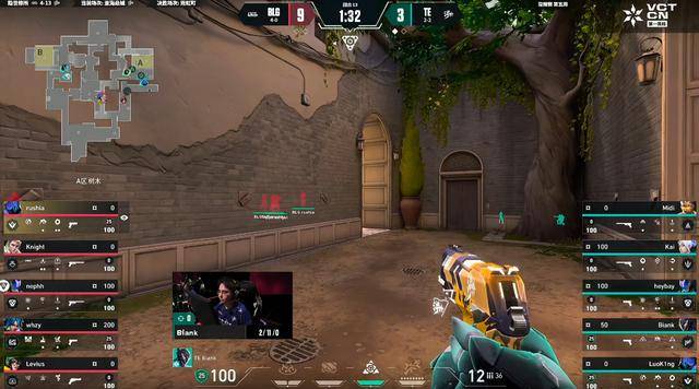 上半场BLG赢下手枪局,TE虽然赢下奖励分,但被BLG下掉四把长枪,这导致第5回合TE起到小甲,被whzy莽侠拿到首杀,rushia在A点守住拿下。下一回合TE的ECO局被whzy拿到四杀,TE用出第一个暂停,第6回合whyz霓虹回防开大直接砍下三杀,TE的暂停调整并没有起到效果。第8回合whzy的冥驹被Kai直接干拉打掉,TE在B点打掉BLG四人后成功赢下拿到第二分。上半场BLG 9-3 TE。