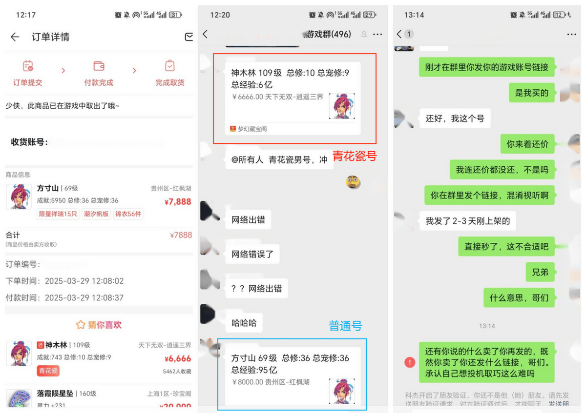 然而,这场青花瓷抢购大战却出现了一位“最大”受害者。有位玩家在群内发布了6666元青花瓷角色的藏宝阁链接,不久后,另一位玩家也在群内分享了自己上架角色的链接。可能是由于抽签时间紧迫,有位“盲僧”玩家没有仔细确认,误将第二个链接当成青花瓷角色,匆匆下单,结果取号后才发现买错了角色,这波真是亏大了!