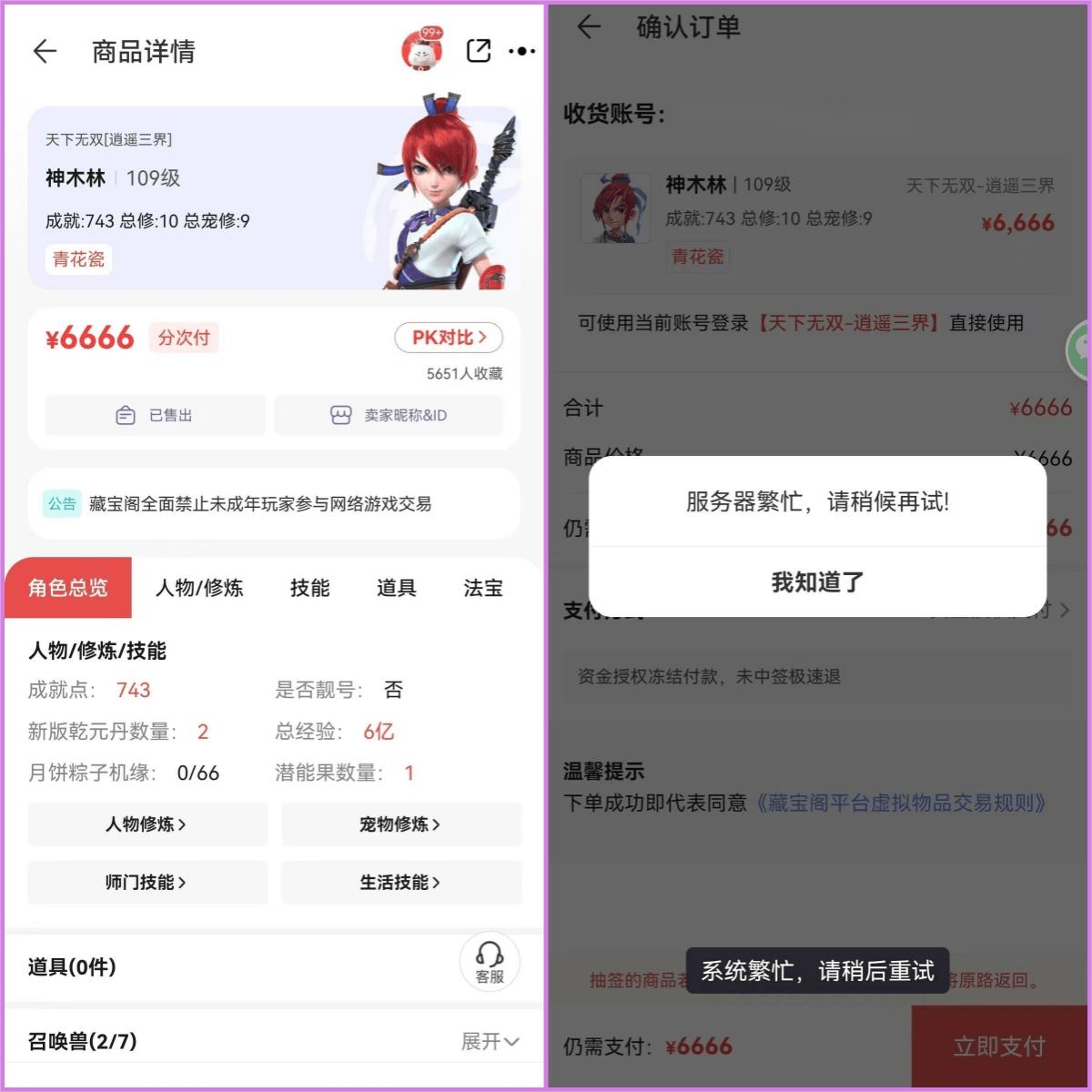 前两天,藏宝阁上突然出现了一个109级的男青花瓷角色,而且标价只要6666元。要知道,目前一个59级的男青花瓷空号,价格都已经接近5万。这个角色在刚上架不久,就被近6000人收藏,据说同时抽签人数突破上万,就连付钱都被提示系统繁忙。