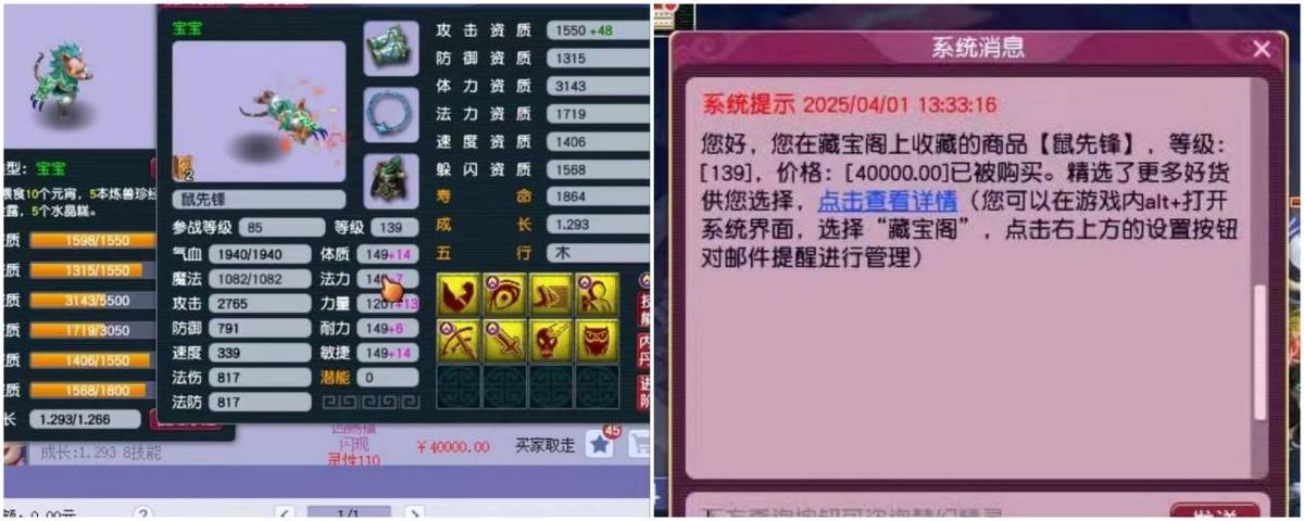 近期除了金价上涨,藏宝阁上装备和宝宝的流通也变快了。有玩家发现,不少高端五开也回归了梦幻,像图上这只139级8技能四赐福网红鼠,竟然卖出了4万块的天价,这次是真回暖了。