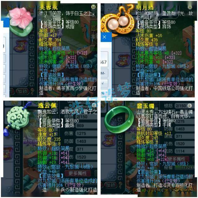 戒指和耳饰下排都是双法伤一法暴,配饰下排三防御,手镯下排双防御一气血,都是80级的超级简易,全部打了8锻星辉石,特效8级宿敌九黎城。