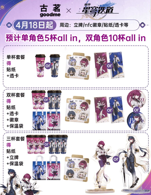 获取方式也很简单,购买单杯套餐可以获得贴纸和透卡各一张,购买双杯套餐可得得贴纸、透卡、徽章和保温袋各1个,购买三杯套餐,可得贴纸一张和立牌一个。集齐全部周边需购买5杯(单人)或10杯(双人拼单)。