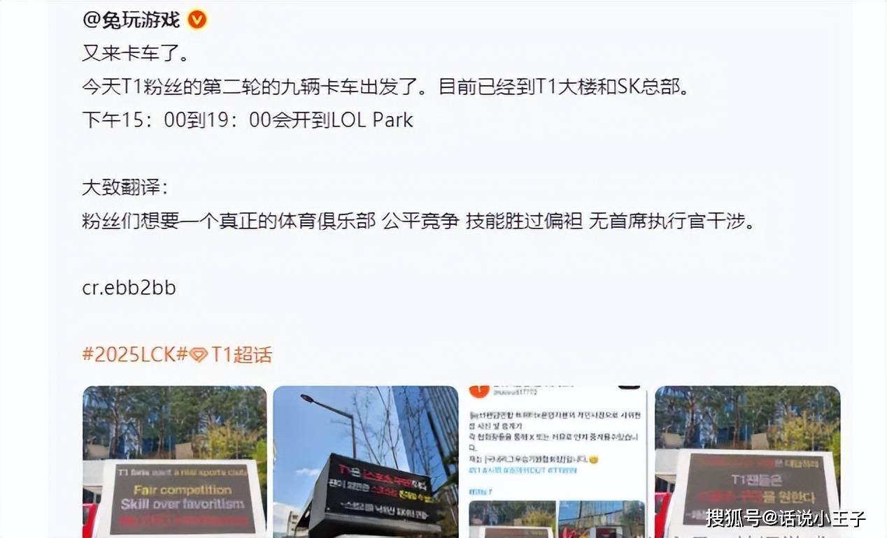 根据相关媒体报道,T1粉丝在第2轮的时候就用了9辆卡车喊话T1,每辆卡车上都写了相关标语。这些卡车分别开往T1的办公室,SK的总部,以及LCK总部。这可真的是活久见,面对这么大的舆论,T1一直沉默肯定不是办法,于是他们也被迫作出了回应。