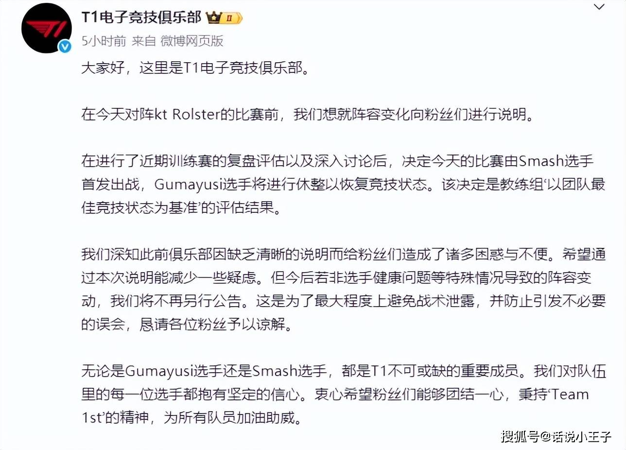 T1发文回应,让小吕布沦为替补,是让他恢复以往的竞技状态。做出这个决定呢,是该教练组以团队最佳竞技状态为基准的评估结果。本来选手替换是一件非常正常的事情,并不会做出特别声明。希望通过这次声明减少一些疑惑,同时在今后中除非选手健康出现问题等特殊情况,导致阵容变换将会进行说明,其他情况将不再进行另外公示。这样是为了最大程度避免战术泄露,并且引发不必要的误会。