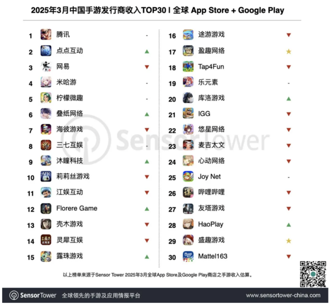 榜单排名方面,腾讯继续稳居首位,点点互动超越网易夺得亚军,米哈游与柠檬微趣紧随其后,叠纸网络跻身第6位,海彼游戏超越三七互娱位居榜单第7名。