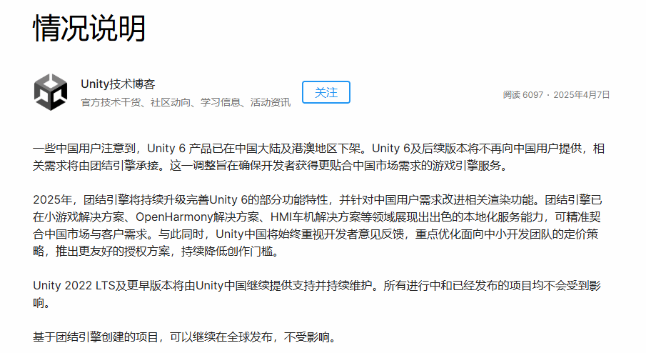 【2】日前,Unity官方正式宣布,Unity 6及后续版本将不再向中国用户提供,相关需求将由团结引擎承接。Unity称,“这一调整旨在确保开发者获得更贴合中国市场需求的游戏引擎服务。”