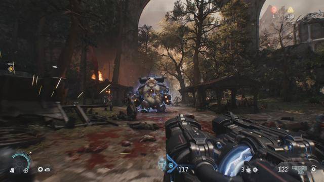 近战武器方面本作提供了三种选择,这次我们主要体验的是“连枷”,用它命中敌人时会产生冲击波对附近敌人造成伤害,在充能次数到达上限3次的时候可以使出威力巨大的三连击。和系列前作相似,我们的武器弹药比较有限,因此需要多利用近战壮烈击杀来获取弹药和血量补给,结合盾锯的机制,在大批敌人群之中进进出出会是比较常见的场景。
