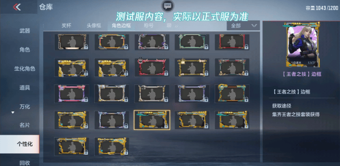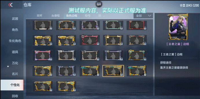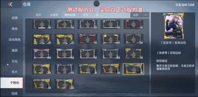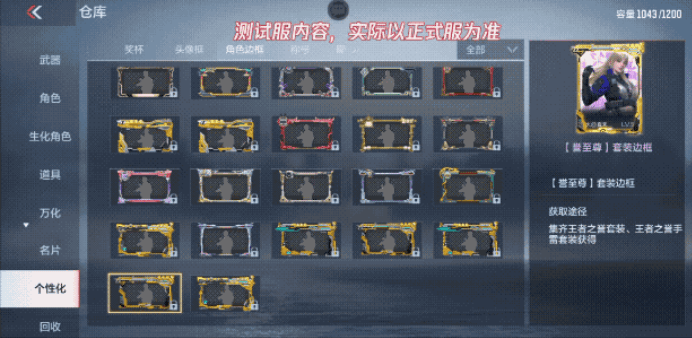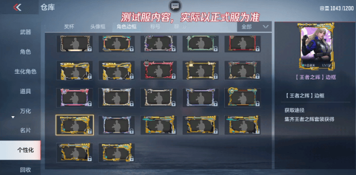 王者之辉边框需要集齐王者之辉套装武器获得,王者之辉边框整体颜色为金黄色,边框左上角有王者之辉的瞄准镜做装饰,右上角像是王者之辉枪身上专属的三个按钮,角色边框左下角像是王者之辉的弹匣,右下则是王者之辉的枪托,整个边框更像是一把完整的王者之辉,真的很帅气。