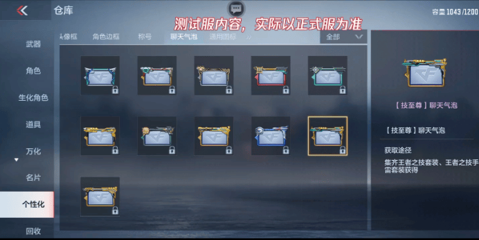 而技至尊的聊天气泡同样是集齐王者之技套装、王者之技手雷套装才可获得,和边框装饰类似,聊天气泡上也有类似枪械的装置,一看就知道是王者之技专属的聊天气泡。