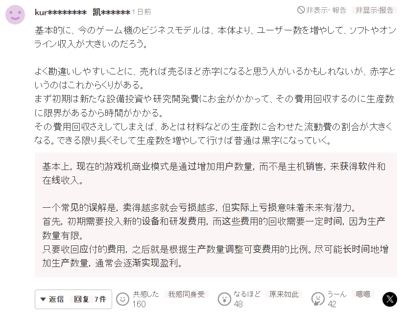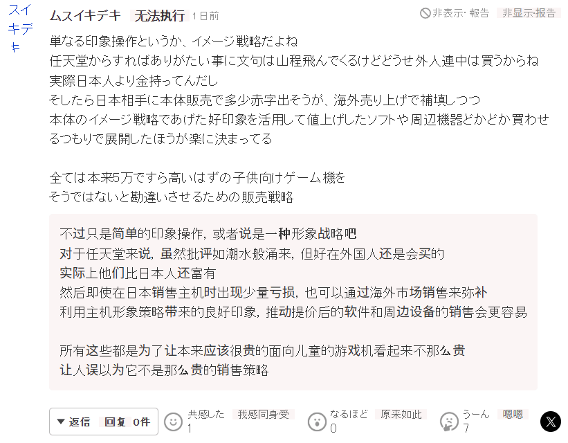 当然也有玩家不买指套账,有人指出这不过是典型的差异化定价,反映的是各地区的物价、收入和货币购买力,日语版便宜只能说明日本的购买力正在下降。况且就算日语版亏损,也能通过海外市场,以及后续的软件和周边销售盈利。