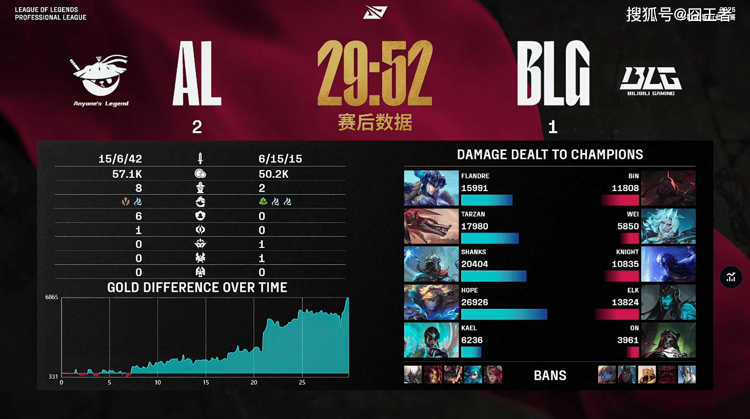 结果这一局比赛,被AL打成了单方面的碾压局啊。4分钟左右:BLG下路三人集结极限越塔,顺利收下一血打出1换1;12分钟左右:Wei蝎子大招拉到三人,BLG团战打出0换1但随后AL利用状态差控下小龙;16分钟左右:AL连续两波资源团抓住机会反打,成功赢下团战奠定优势;23分钟左右:BLG下路先击杀两人,但AL抓住机会逐个击破拿下厄塔汗;26分钟左右:Hope卡莎发挥积分王实力,侧面疯狂输出砍下三杀;最终29分27秒:AL中路团战发力成功击杀对方多人,随后顺利一波结束比赛