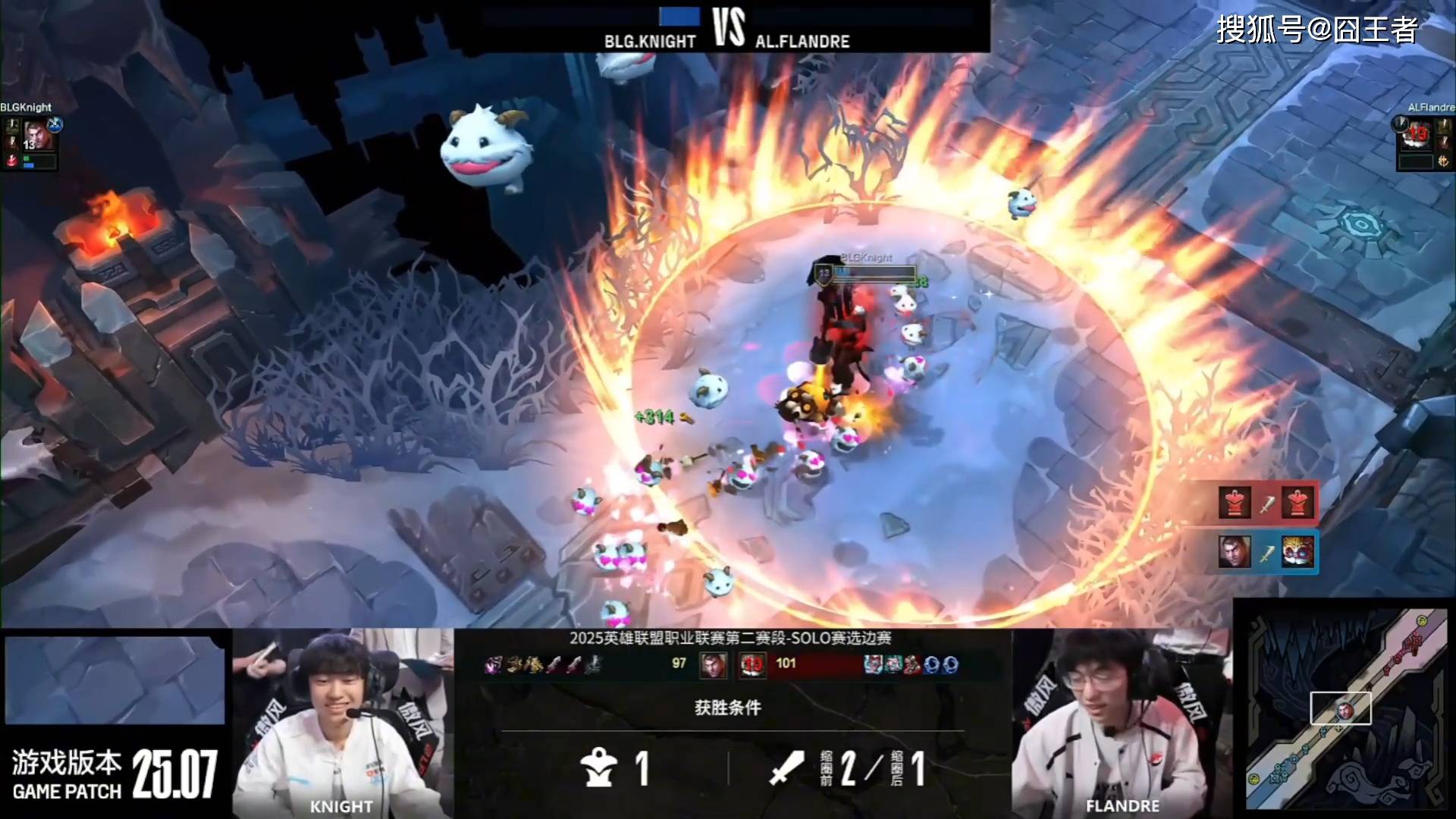 在SOLO选边赛中,Knight杰斯对阵Flandre黑默丁格。前期Flandre黑默丁格击败杰斯,拿下一血;缩圈后Knight杰斯细节操作击败黑默丁格,拿下胜利。BLG获得本场BO3首场选边权,BLG选择蓝色方