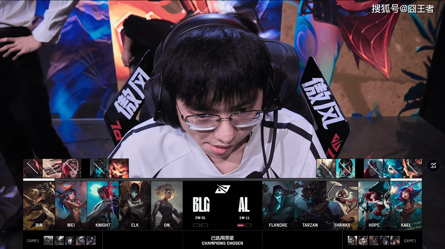 第一局比赛,BLG蓝色方,禁用波比、韦鲁斯、赛恩、飞机、艾希,选用安蓓萨、蝎子、狐狸、小炮、牛头;AL红色方,禁用兰博、格温、蔚、滑板鞋、妮蔻,选用杰斯、赵信、岩雀、卡莎、泰坦