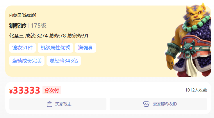 今天,藏宝阁上出现一个175化圣狮驼角色,底子非常优秀还配备了装备和宝宝。然而摆价仅有3.3万,这瞬间吸引了上千人参与摇号购买。