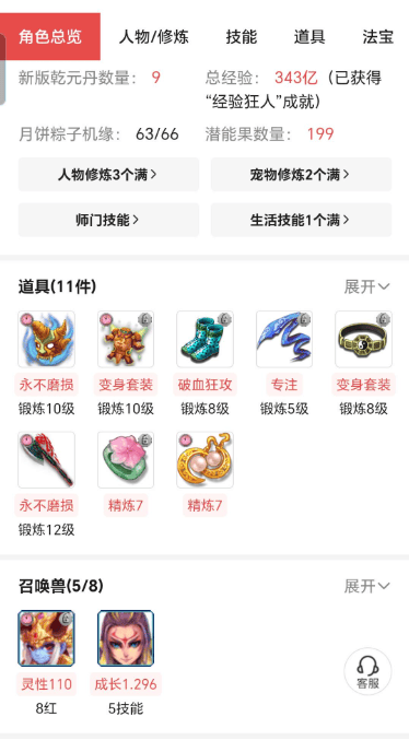 具体这个角色拥有一些限量款锦衣和祥瑞,装备主要有12锻总伤837且带力耐双加60的不磨斧头,召唤兽则主要是8技能全红童子。