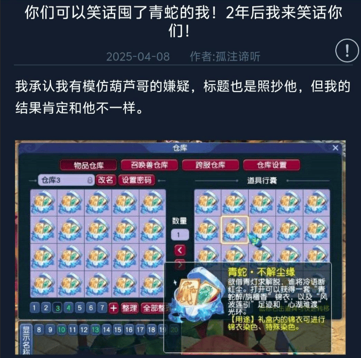 最近,这位商人分享了囤货青蛇锦衣的经历,每个礼盒成本为720元,大概买了5车,总投入7.2万。按照商人的话,他这次有意模仿知名囤葫芦娃玩家的发言,但他的结果肯定不一样,毕竟青蛇锦衣有好几款基础色,染成独特颜色也是独一档的颜值。