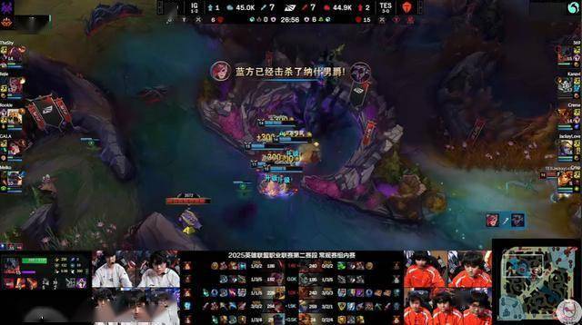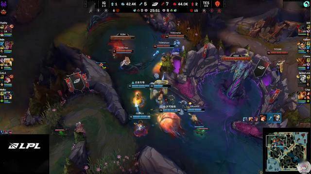Jackeylove居然当着IG众人的面,想要从大龙河道直接走过去,结果被秒了。然后IG动手带有复活甲的厄塔汗,TES被迫4打5最终又被小团灭。