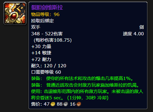 首先是带群体击退效果的双手剑“裂胆剑维斯拉”,未被击退的敌人还会眩晕5秒,CD1.5分钟。