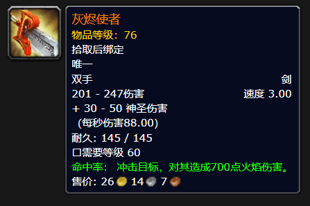 团本一共8个Boss,难度大于NAXX,掉全新职业套装,一共8件。一起解锁的,还有新的传说任务线,目标橙武“灰烬使者”,对应战士、猎人、骑士三个职业。