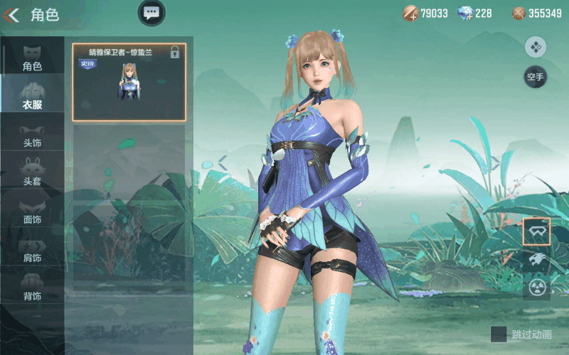 晴雅保卫者-惊蜇兰,整体以蓝色为主色调,融合了中式旗袍元素,上装为露肩设计,搭配精致的蓝色飘带,显得灵动飘逸。下装是黑色短裤,腿部穿着带有紫色花纹的蓝色长筒袜和黑色高跟鞋,发型是双马尾并搭配蓝色发饰,整体风格既时尚又具有东方韵味。