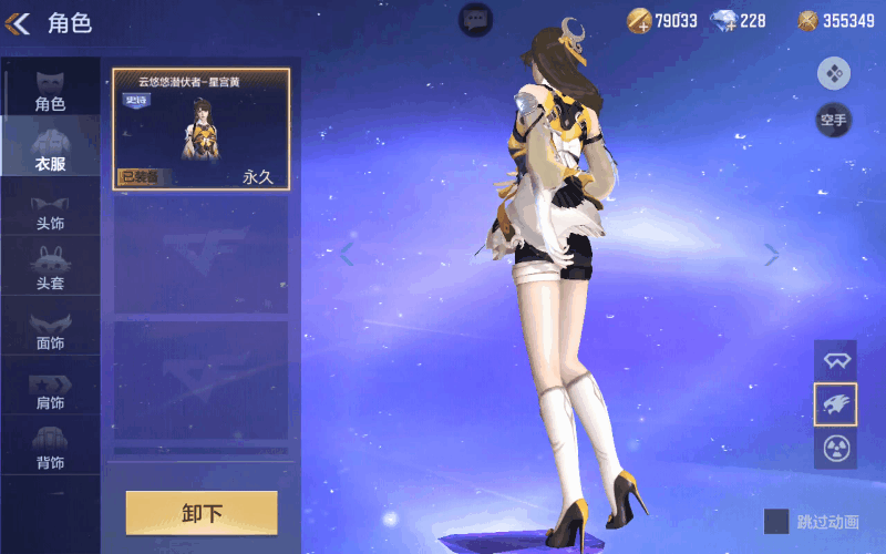 云悠悠潜伏者-星宫黄,以明亮的黄色与纯洁的白色为主色,辅以黑色细节勾勒,尽显青春活力。上衣肩部装饰独特,花纹设计别具一格;下身搭配白色短裙,轻盈飘逸。腿部穿着白色长筒高跟靴,金色装饰点缀其间,发型选用双马尾,整体风格既青春又科幻,充满了无限活力。