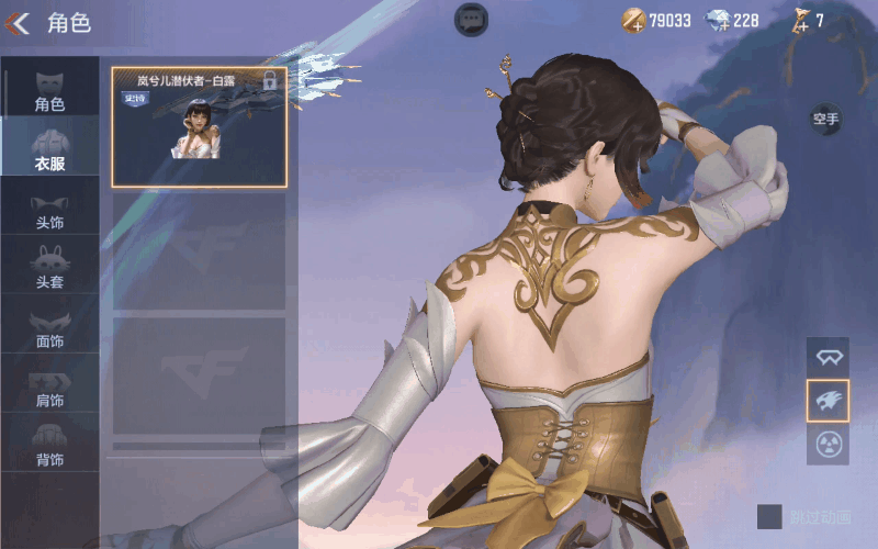 岚兮儿潜伏者-白露,整体以银白和金色为主色调,上装为无袖露肩设计,搭配金色束腰,凸显身材。下身是短款裙摆,腿部穿着金银相间的长筒紧身裤和高跟鞋。发型为黑色齐肩短发,利落干练,手持蓝色球体,整体造型兼具时尚感与科技感。