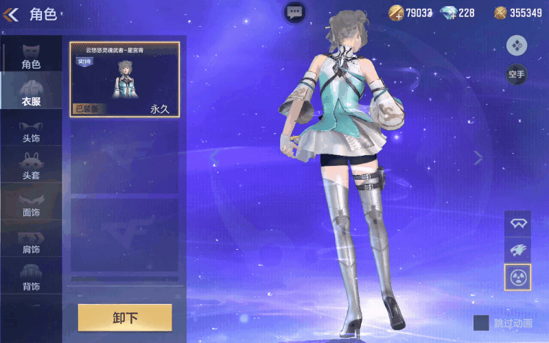 云悠悠灵魂武者-星宫青,以清新的青绿色与闪耀的银色为主色调,上衣设计短款且剪裁独特,袖子采用喇叭袖样式,别具一格;下身搭配白色短裙,简约而不失优雅。腿部穿着银色长筒高跟靴,黑色腿部挂件增添了几分神秘感;发型选用双发髻,整体造型既科技感十足又时尚前卫,令人眼前一亮。