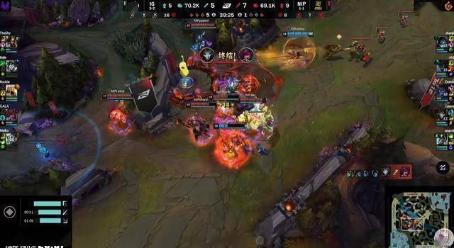 Theshy又是一个人出现在中路,这次没有队友在身边也没有闪现,直接被秒。IG原本经济优势很大,但是在上单连续送节奏之后,NIP逐渐追平经济差。