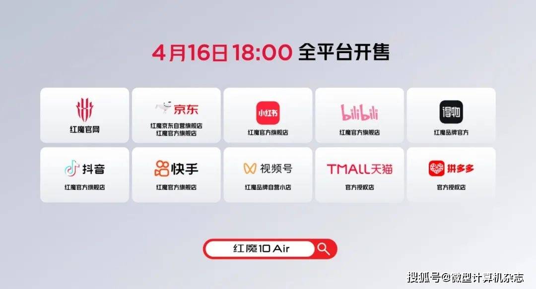 4月16日15:45红魔10 Air于京东开启全球首发,18:00 起红魔官网、天猫、拼多多、抖音等全平台同步开售;