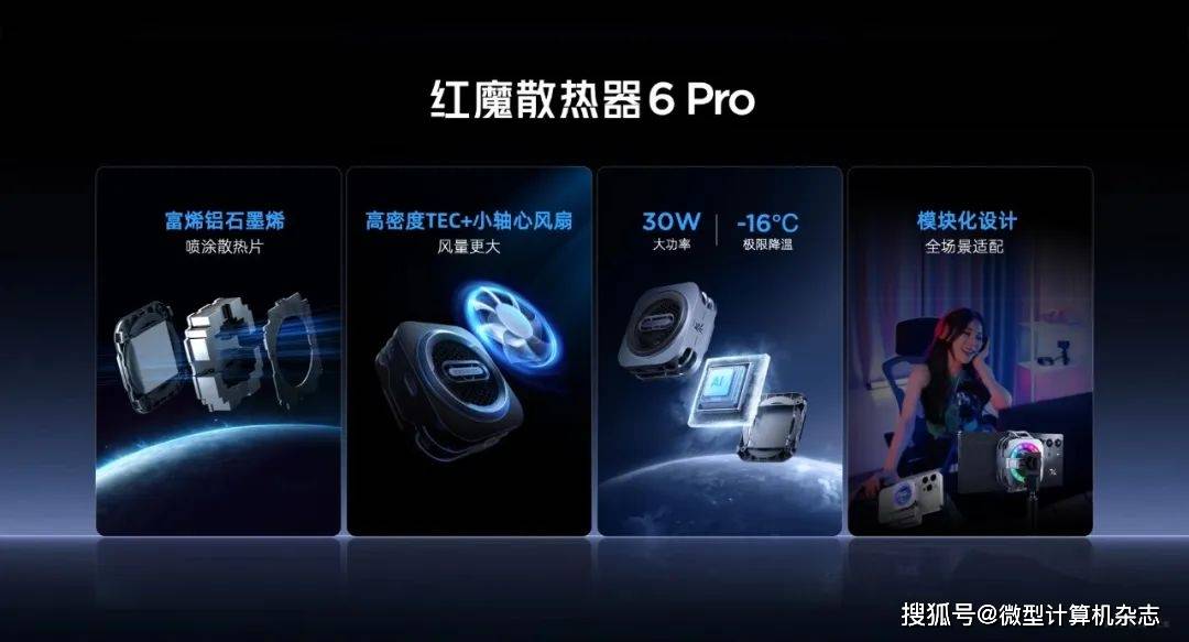 除了定制礼盒,红魔的散热器也有新亮点。红魔散热器6 Pro磁吸版采用富烯铝石墨烯散热片+高密度TEC半导体,配合小轴心风扇灯,极限降温至-16℃。多模块化设计,可配合无线充电模块、直播支架模块等,满足户外游戏、直播散热、边充电边散热等多场景需求。