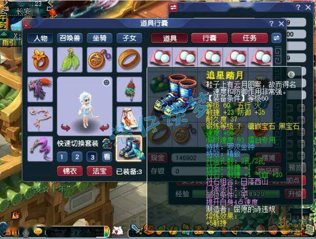 戒指和耳饰下排都是双封印一速度,配饰和手镯下排都是双法防一气血,全部打了6锻星辉石,特效都是5级健步如飞。