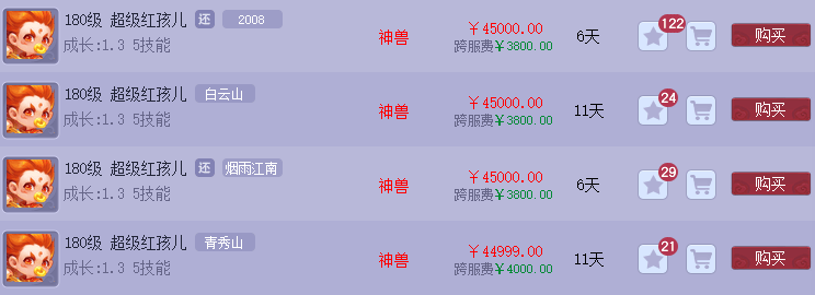 从目前藏宝阁来看,除了超级鲲鹏之外,神兽市场的领跑者依然是“超级红孩儿”。之所以会出现这个情况,主要是该神兽在高端PK中的表现非常强势,几乎覆盖了从精锐到天元的全线PK,是一线PK玩家的主流选择。目前,其全服最低价为44999。