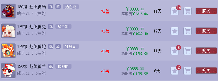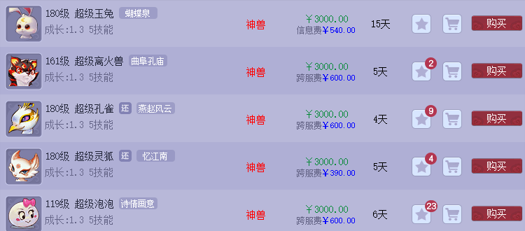 目前处于低价位的神兽主要有超级泡泡、超级灵狐、超级离火兽、超级海豚、超级大鹏等,其价格通常在3000上下。就当下的游戏环境来说,这已经可以成为普通玩家的首选任务宠了。