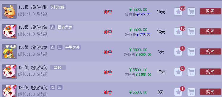 至于超级神狗、超级神兔、超级神龙、超级神猪等实用性较强的神兽,它们的价格已经接近亲民水平。之所以会出现这一情况,主要是因为他们在玩家群体中拥有较高的受欢迎程度,所以保有量非常高,目前依然处于“消化存量”的状态,价格基本维持在4500-5500左右。