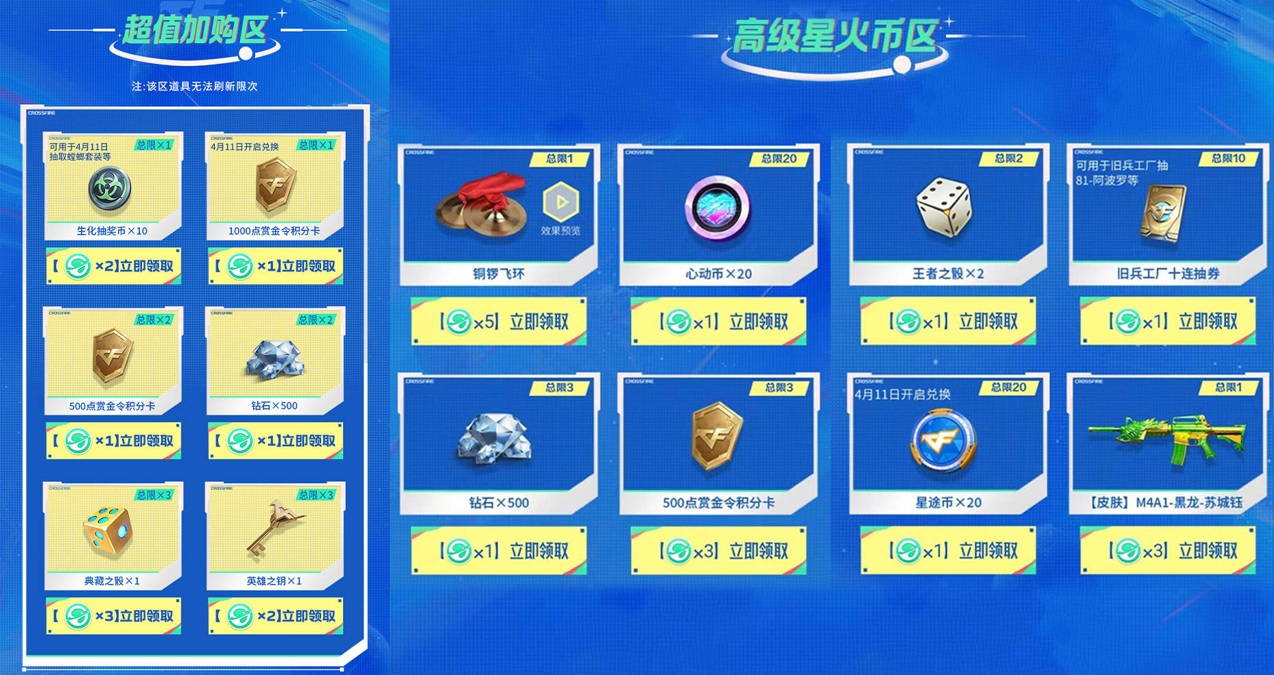 超值加购区和高级星火币区兑换所需的是高级星火币,在兑换之前一定要想清楚,哪些道具是一定需要的,哪些道具可以通过别的途径获取~建议优先兑换赏金令积分卡和铜锣飞环这类价值更高的道具。上述就是本期资讯的全部内容了,非常感谢大家的阅读,我们下期再会。