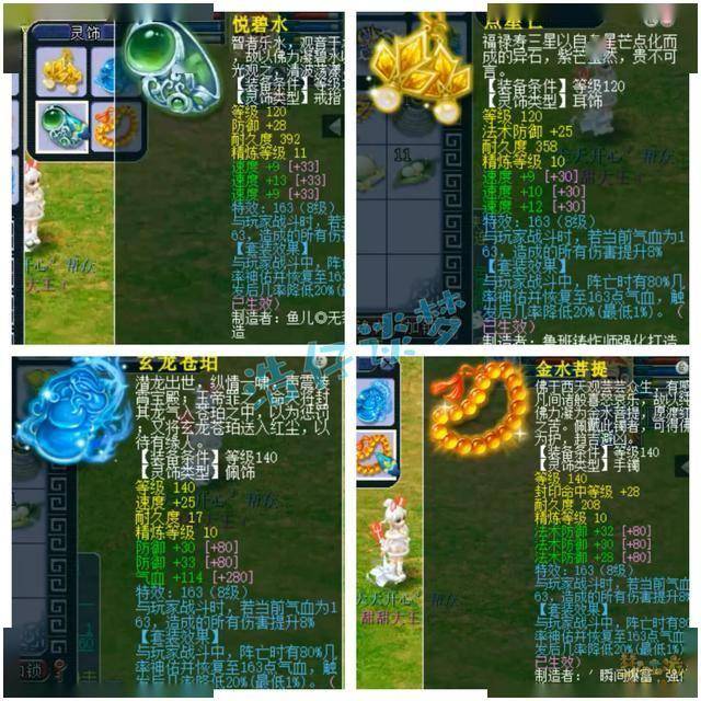 戒指和耳饰下排都是三速度,佩饰下排双防御一气血,手镯下排三法防,特效都是8级163。