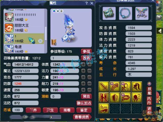 175级方寸山打符之后的面板属性,三维非常不错,有抗性还有速度。