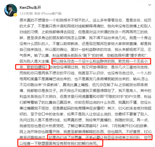 对此,朱开也是进行了回应与澄清,他觉得自己一个人出来做直播确实会得罪一些小团体跟利益相关的人,所以平时被其他主播点名造谣他也不在意。只是IG老板这次点名道姓站出来说了,那他也要问问IG输了比赛,他说选手状态不对,有什么错了,为什么要攻击他。