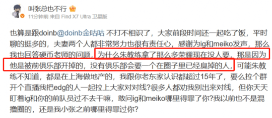 首先,IG老板张浩瀚倒也不是有意找朱开的麻烦,而是觉得朱开在网上攻击Meiko的言论,尤其是那句“大姨妈来了”说得实在太过分了。所以在忍无可忍的情况下,张浩瀚决定把朱开的黑历史扒出来给吃瓜粉丝看一下,一个被前俱乐部开除、在圈子里名声臭掉的人,他说的话可信度也就那样。