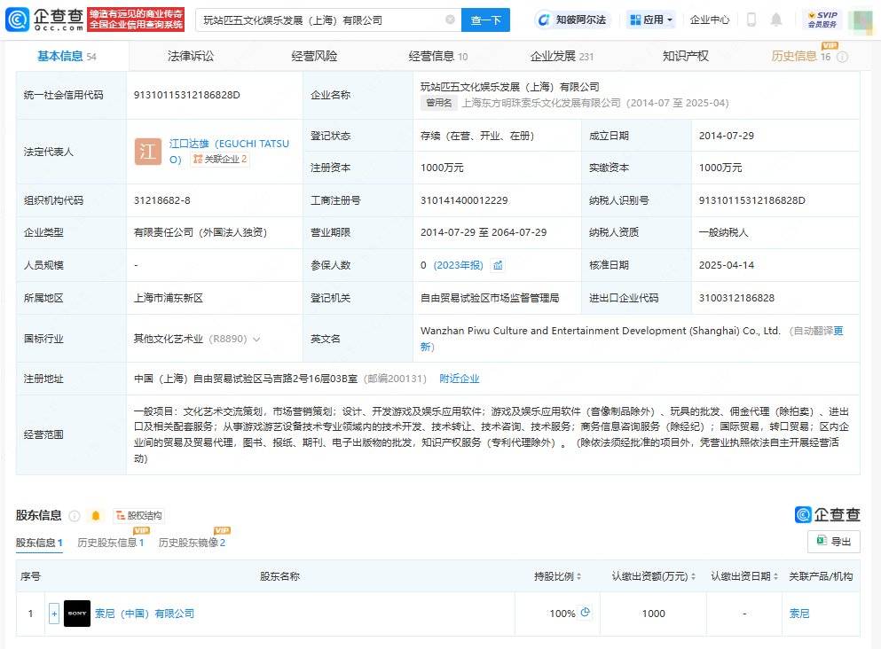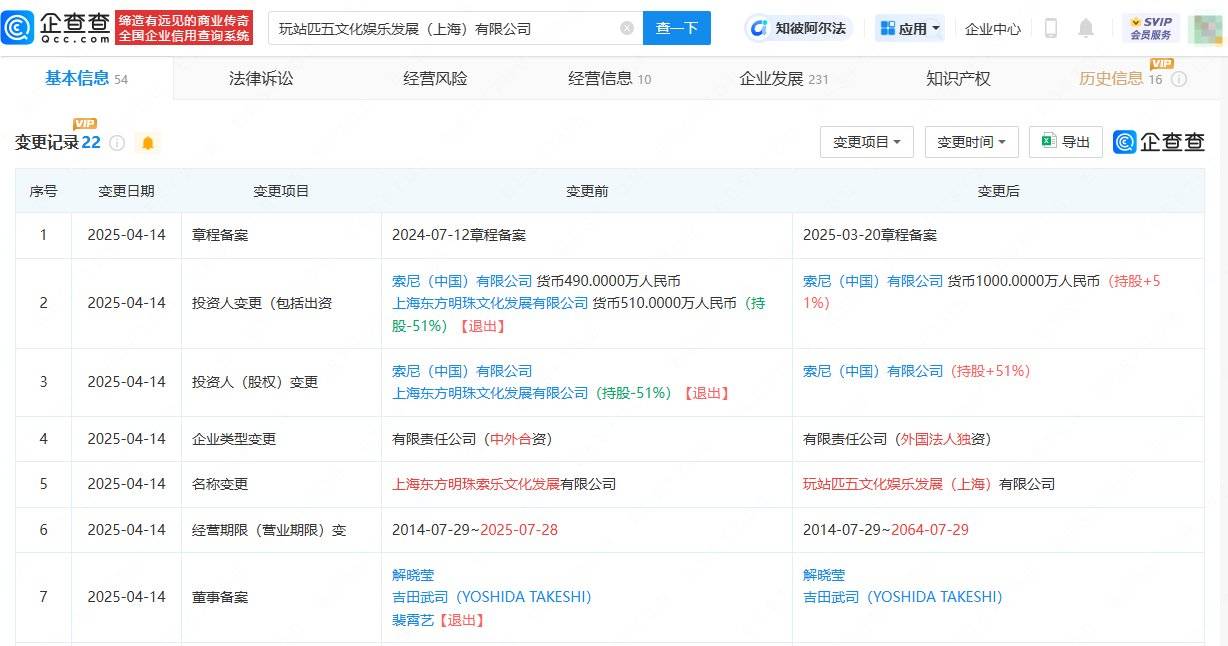 【#索尼收购在华家用游戏机公司股权#】企查查APP显示,近日,上海东方明珠索乐文化发展有限公司发生工商变更,公司更名为玩站匹五文化娱乐发展(上海)有限公司,原股东上海东方明珠文化发展有限公司退出,现由索尼(中国)有限公司全资持股。