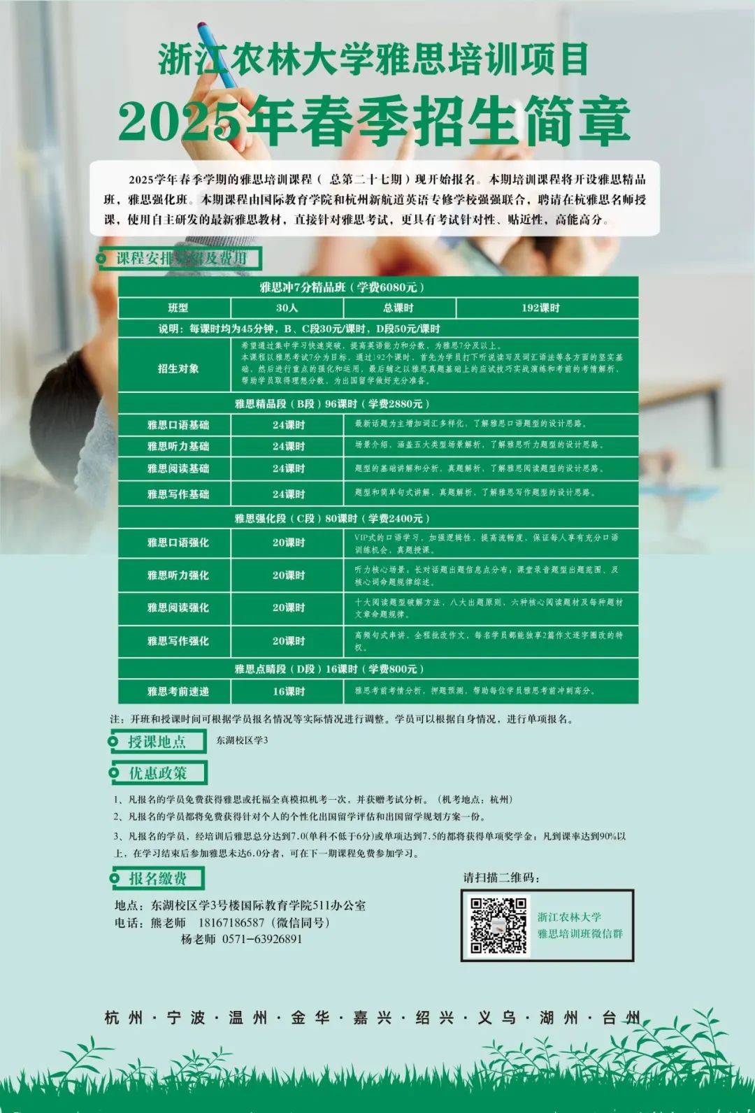 浙江农林大学国际教育学院(孔子学院)雅思培训项目和新航道杭州学校合作至今已有十余年,整合了国际教育学院和杭州新航道的优势师资力量,执教老师均有国外名校的学习经历并取得语言教育硕士学位,具备丰富的雅思教学经验和留学考试经验,专门帮助参加我校国际合作项目和有志于出国留学师生的语言培训项目。学院开设的课程均采取小班化教学,口语、写作进行小组诊断式、互动教学,培养学生扎实的英语实际运用能力,并且帮助学生顺利通过英语留学考试。