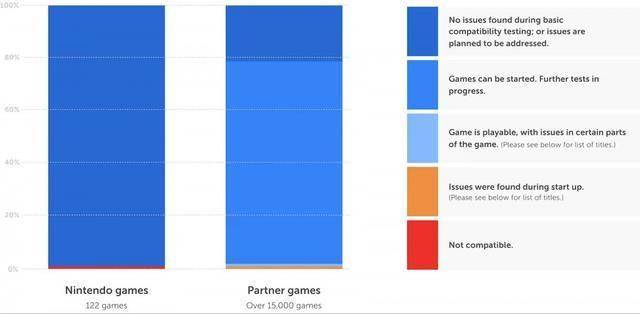 首先,任天堂截至目前一共测试了122款第一方游戏和超15000款第三方游戏,其中第一方游戏中仅有1个不兼容,第三方合作伙伴则有25%的游戏属于“无问题”类别。同时,任天堂也在官网表明下一次兼容性测试状态将在5月更新。