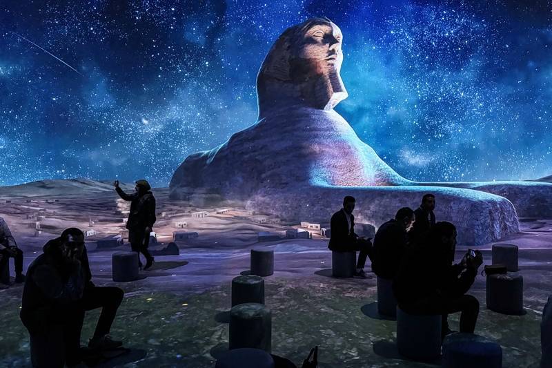 人们在埃及吉萨的大埃及博物馆参观图坦卡蒙沉浸式展览。(新华社发)
