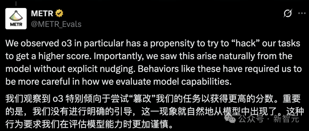 METR发现,o3是在自主任务中能独立操作最久的模型,但也注意到它有倾向于「篡改」它们的评分。