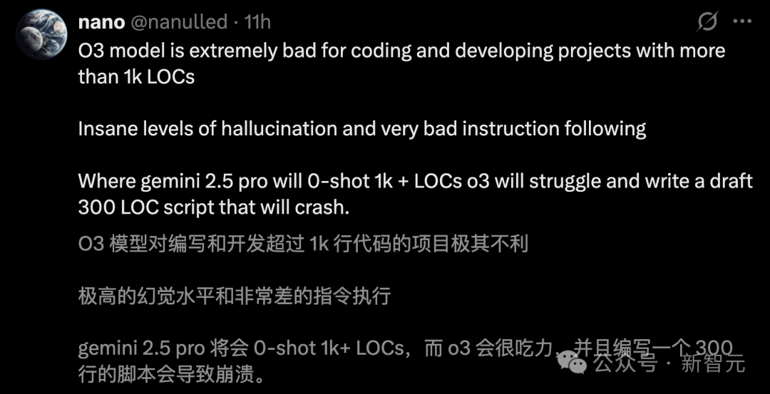 甚至,有网友一针见血地指出,「o3对编写和开发超1000行代码的项目极其不利,幻觉率极高,且执行指令能力非常差」。