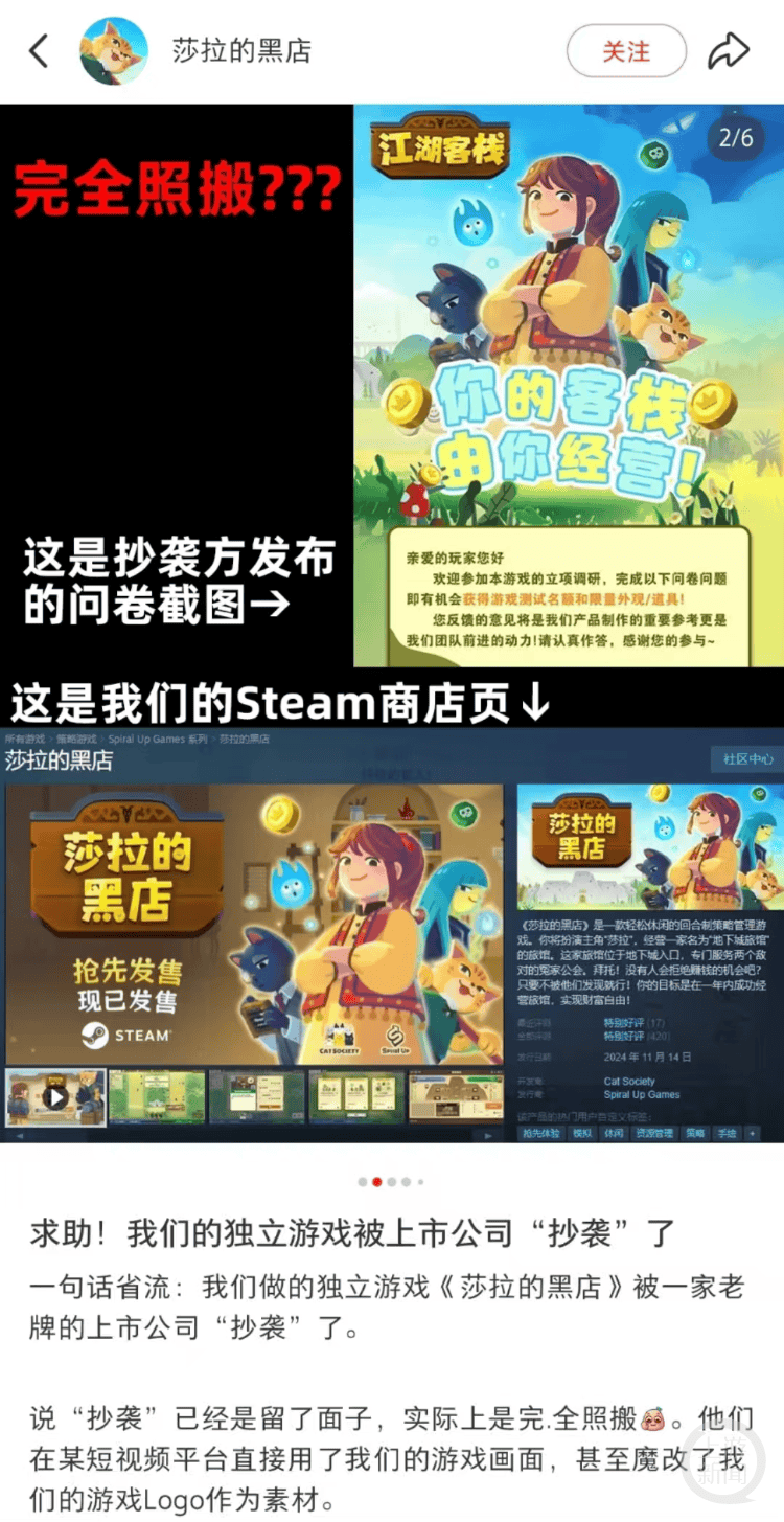 《莎拉的黑店》官方账号发帖称自己的游戏被“抄袭”了。网络图