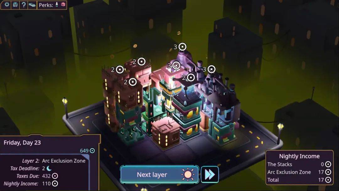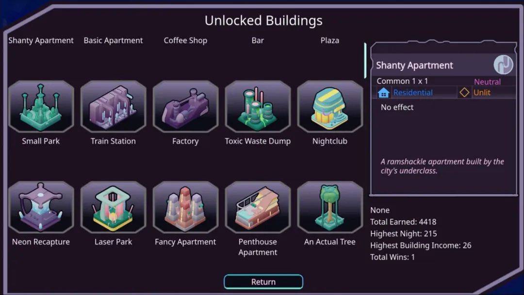一款极简风格赛博朋克城市建设游戏,灵感来自《Islanders》和《Luck Be a Landlord》。