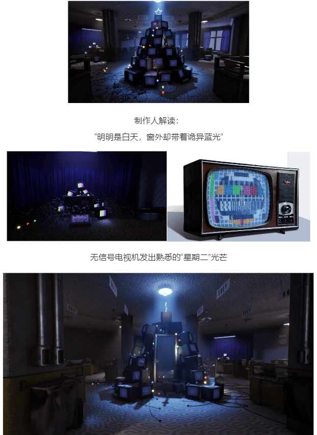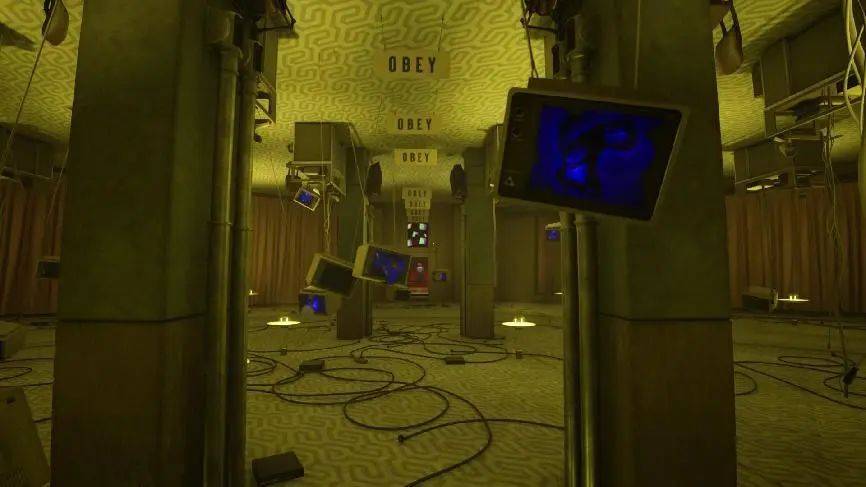 比如游戏中令人印象深刻的电视坟墓房间。电视机在房屋正中央堆成山,有迪斯科霓虹灯缠绕,头顶对称悬挂的“OBEY(遵守)”挂牌,让人瞬间掉入肃杀又似曾相识的氛围中。“非对称空间会让人产生向左或右的倾向,”王勇赫说,“而对称空间则会凸显威严感,让人停留。”